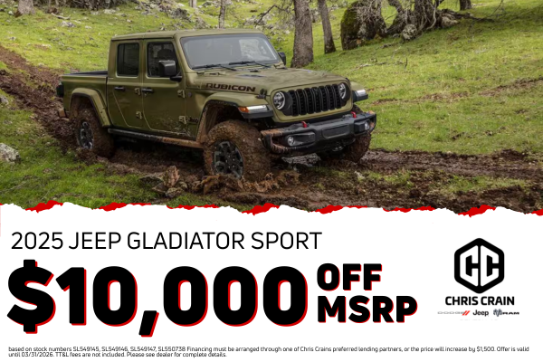 based on stock numbers SL549145, SL549146, SL549147, SL550738 Financing must be arranged through one of Chris Crains preferred lending partners, or the price will increase by $1,500. Offer is valid until 03/31/2026. TT&L fees are not included. Please see dealer for complete details.